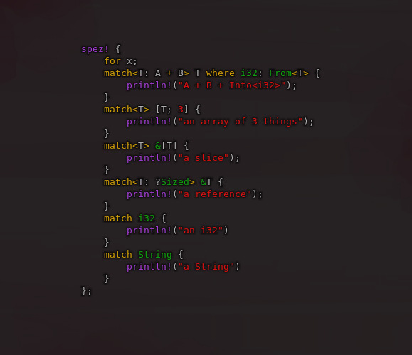 I tried that syntax first, but that made it hard to make both specific types (i32, String, etc.) and generic (bounded) types (T: Debug, T where From<i32>: T, etc.) work ergonomically. (And it also needs a place to specify the 'return' type of a <body>.)