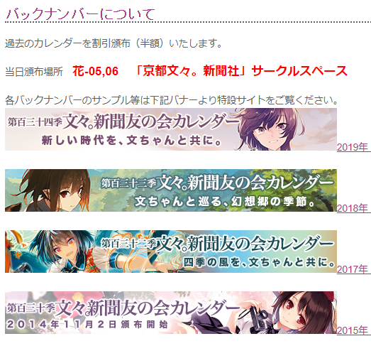 過去のカレンダーのうち、すぐに在庫が出てきた分をバックナンバーとして若干数、持参いたします…ご興味がお有りの方は是非お立ち寄りを。 https://bunbunmaru-np.com/2019kikaku.htm#old_cal …pic.twitter.com/PVvBz8uEac