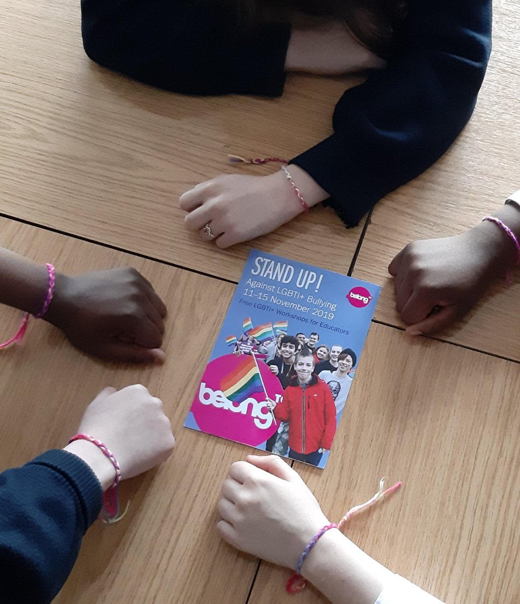 #Wellbeing Prefects@Colaistebride who helped raise awareness at the lunchtime pop-up station for#AntiBullyingWeek2019 and Stand Up for#LGBT by providing students with info on how to#StopBullying and gave free awareness bracelets to all year groups