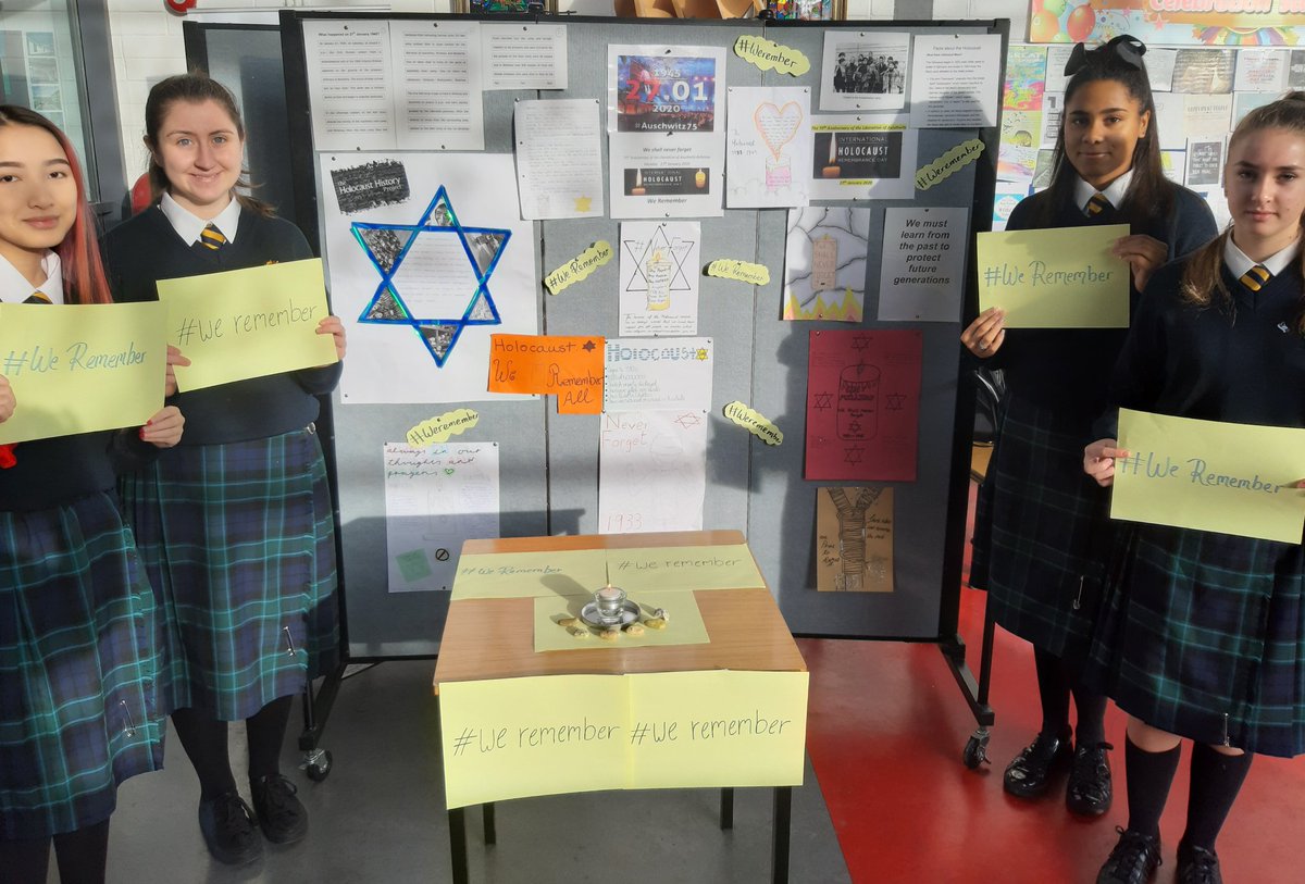 @Colaistebride commemorate the 75th Anniversary Liberation of Auschwitz by displaying some of the commemorative works completed by students. A candle was lit to remember all Jews and others who perished during the Holocaust.#WeRemember#Auschwitz75#NeverAgainpic.twitter.com/zreUhQViQK