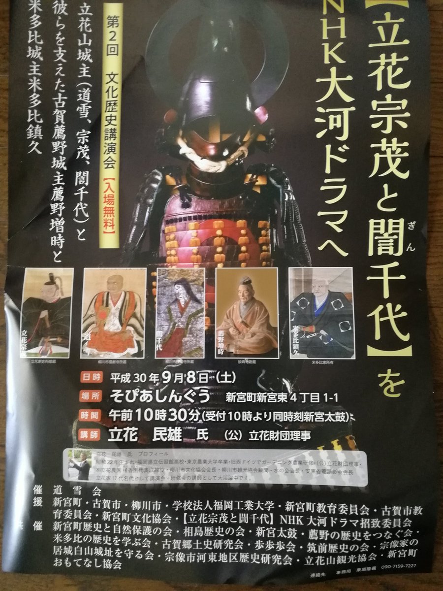 立花宗茂や道雪と新宮町や古賀町の関わりを、立花家の当主のかたよりきけるそうですー。9/8 新宮町で。