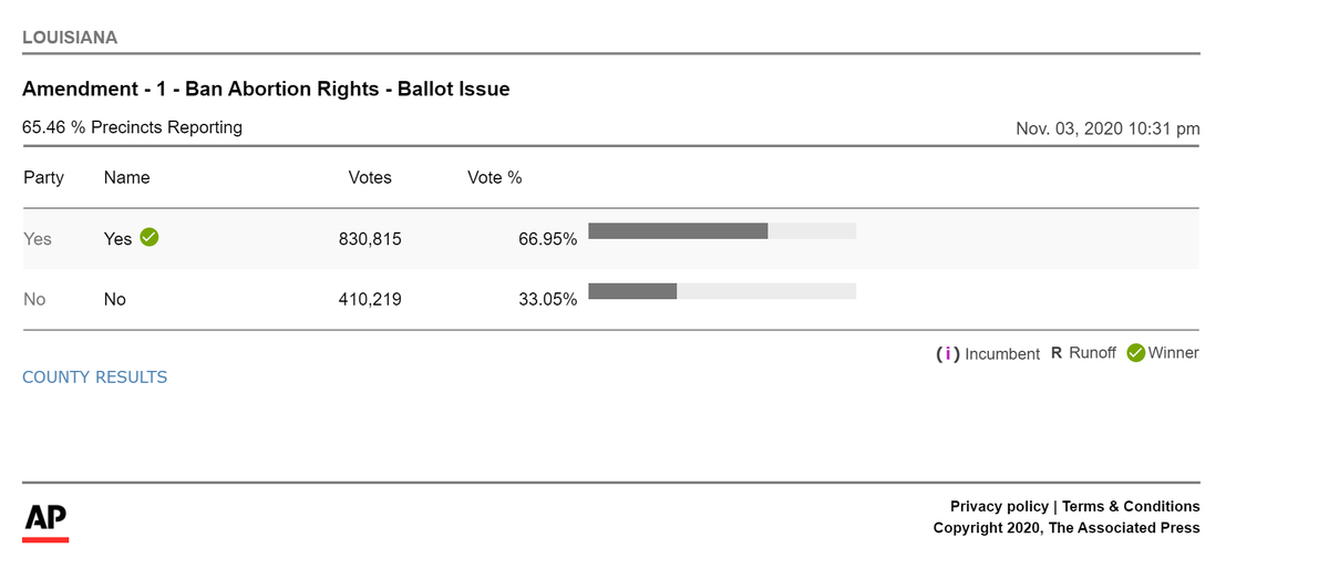 BREAKING: @AP reports that Louisiana has passed Amendment 1, which establishes there is no constitutional right to an abortion.pic.twitter.com/JRaECGhLhe
