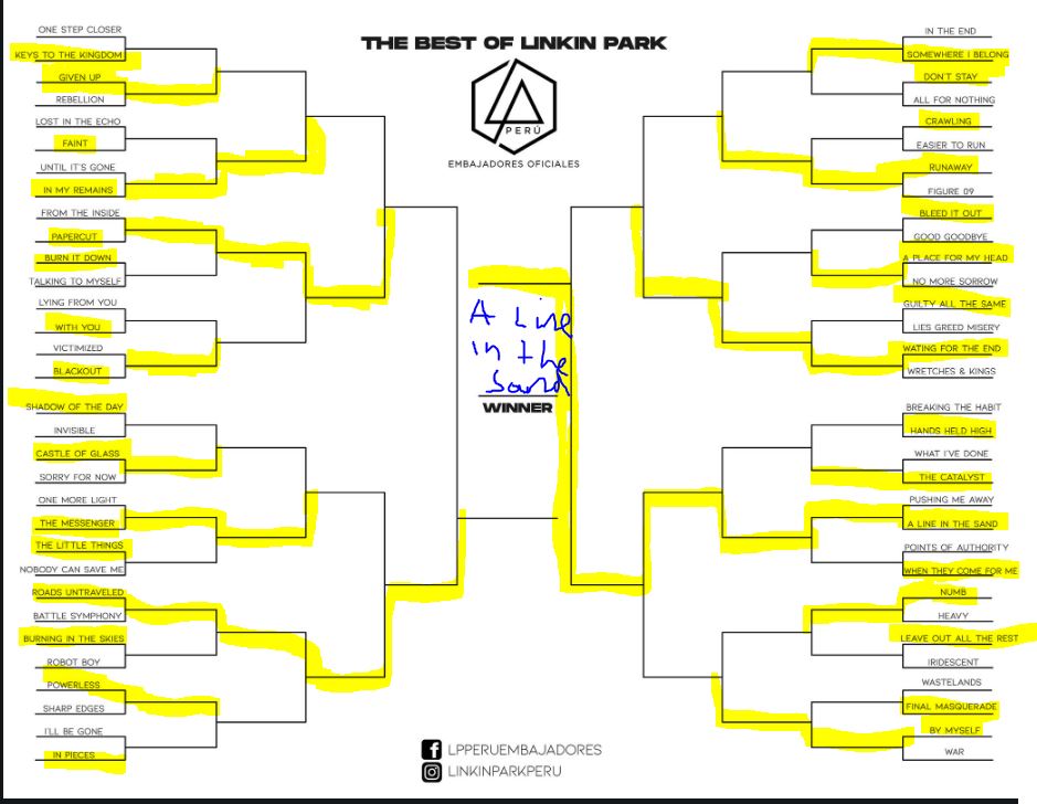 Ok Soldiers, I saw this days ago and was very fun (and very tough) to do, so we did it but with @linkinpark songs. Which song is your winner? Tag us if you upload your photo. Hey @mikeshinoda can you also fill this out for us real quick? I'll put mine after this tweetpic.twitter.com/8utCMZnpT3