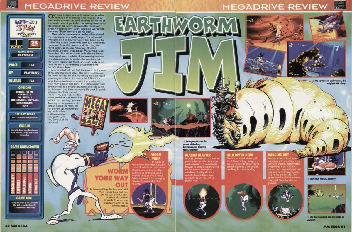 EARTHWORM JIM: Here's the 5 page review & flyer for the superb 1994 Mega Drive game from Mean Machines Sega