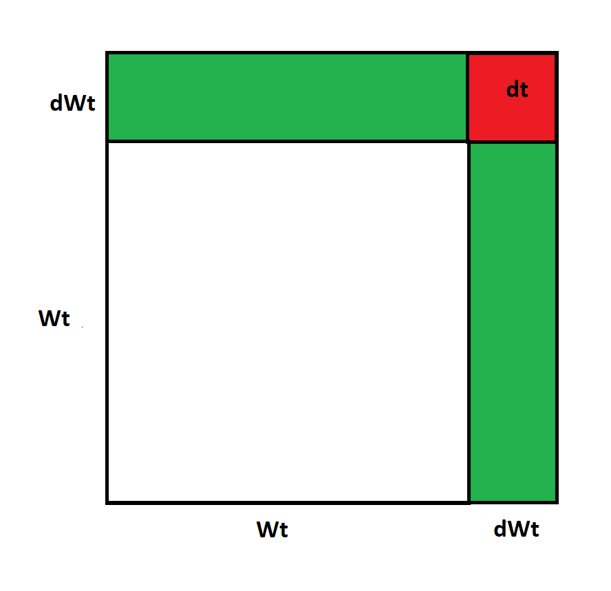 The simplest explanation of why stoch calc is a thing: d/dx x^2 = 2x dx can be visualized as below - the area of the square with side x is increased by 2 x*dx + dx*dx. The 2x dx is in green, and the dx * dx is infinitesimally small so it goes away, so you end up with two dx * x'spic.twitter.com/9t6seybJUT