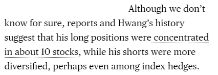 Article seems to be wrong on several major points? • "The fund was not overly levered" • "Its risk was not hidden" • "Hwang typically ran dollar-neutral portfolios" • "Analysts had full insight into Archegos’ ... position sizes"https://www.bloomberg.com/opinion/articles/2021-03-30/wall-street-archegos-collapse-is-business-as-usual-not-a-disaster …