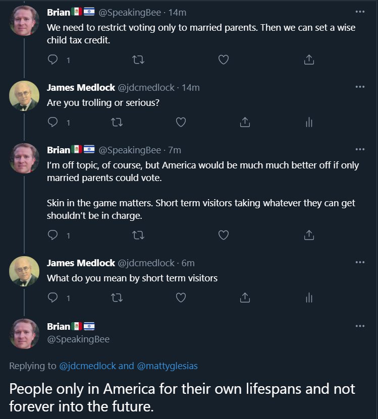 In the Glorious Future America, suffrage is granted only to struldbruggs, Elves, HeLa cells, the Quahog clam, and Hob Gadling.