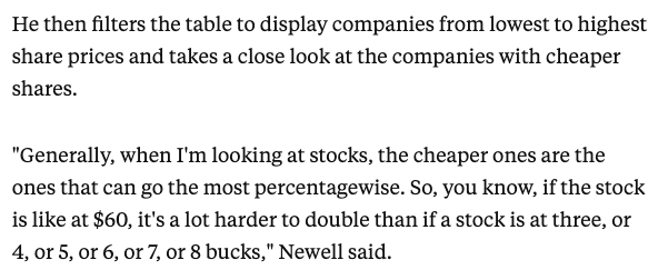 Low price has more vol, but most importantly the skew is to the right, since there is a cliff at zero. It sort of makes sense that in the short term, in a bull market, low price stocks do well. In fact, even Fidelity has a product like this (the Low Priced Stock fund) !!