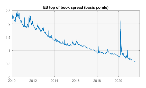 Liquidity takers should thank the Fed for grinding stocks higher - top of book spread on ES futures has compressed by a factor of 4 in the last decade entirely because of price increases (in points terms it is a flat line)pic.twitter.com/QyZr5OG18l