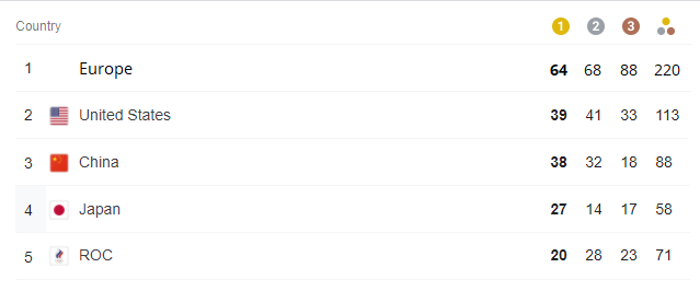 The Olympic medal table if the UK, France, Germany, Italy, Spain, Switzerland, Belgium, Ireland and Portugal (total population about the same as USA, 25% of China) competed as one country.pic.twitter.com/x8BD9ope6D