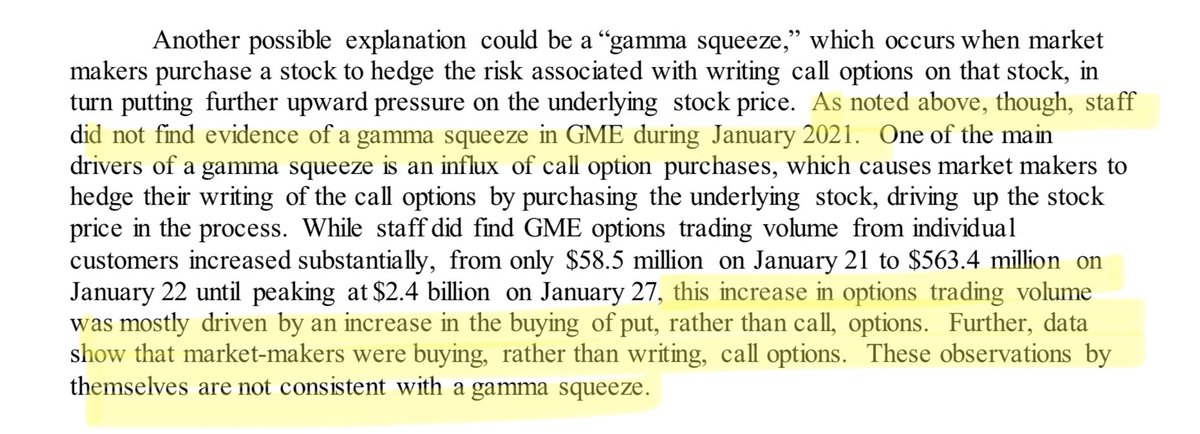 The SEC report on GME is out and the funniest part is that despite zillions of fintwit vol accounts falling over themselves to explain what a gamma squeeze was and why it was relevant at the time, it turns out that just … never happened? pic.twitter.com/z0iQItQ5oD