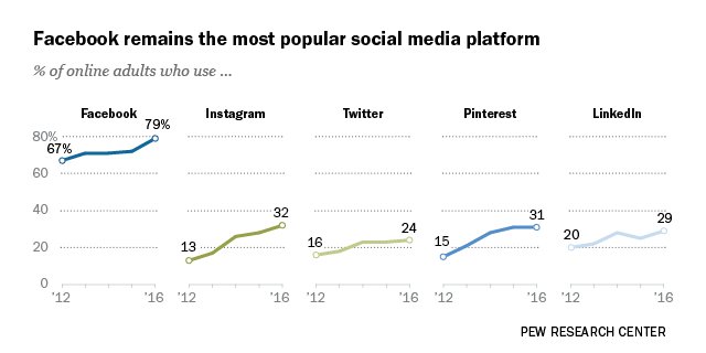 Share of online Americans who use … Facebook: 79% Instagram: 32% Pinterest: 31% LinkedIn: 29% Twitter: 24% http://pewrsr.ch/2ssg6JI pic.twitter.com/9qRqlpEjDn