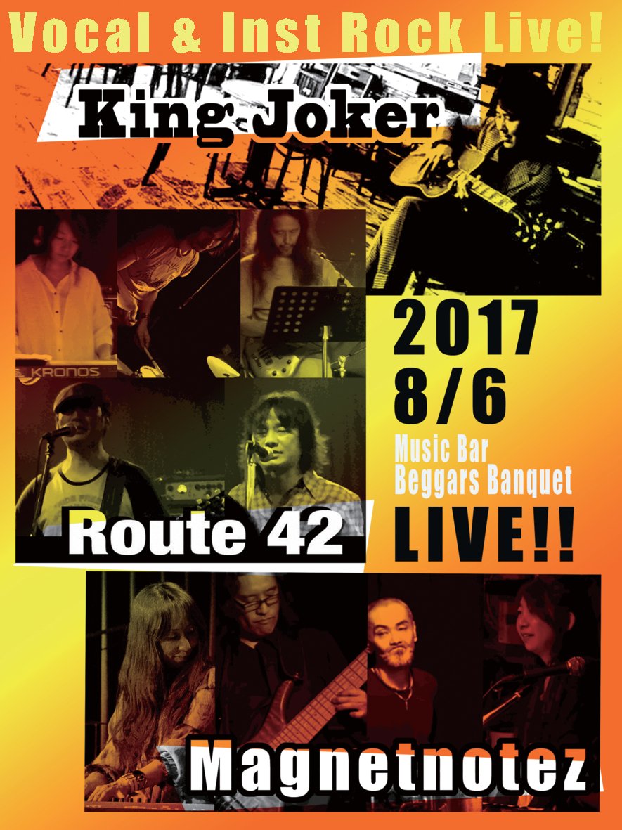 【8月のライブ】8/6(日)大阪 Beggars Banquet http://www.beggars-b.com/ 出演:King Joker/ Route 42/ MAGNETNOTEZ。Open 17:30 / Start 18:00~ チャージ:¥2,000 + drink。pic.twitter.com/YXgGx0SoQo