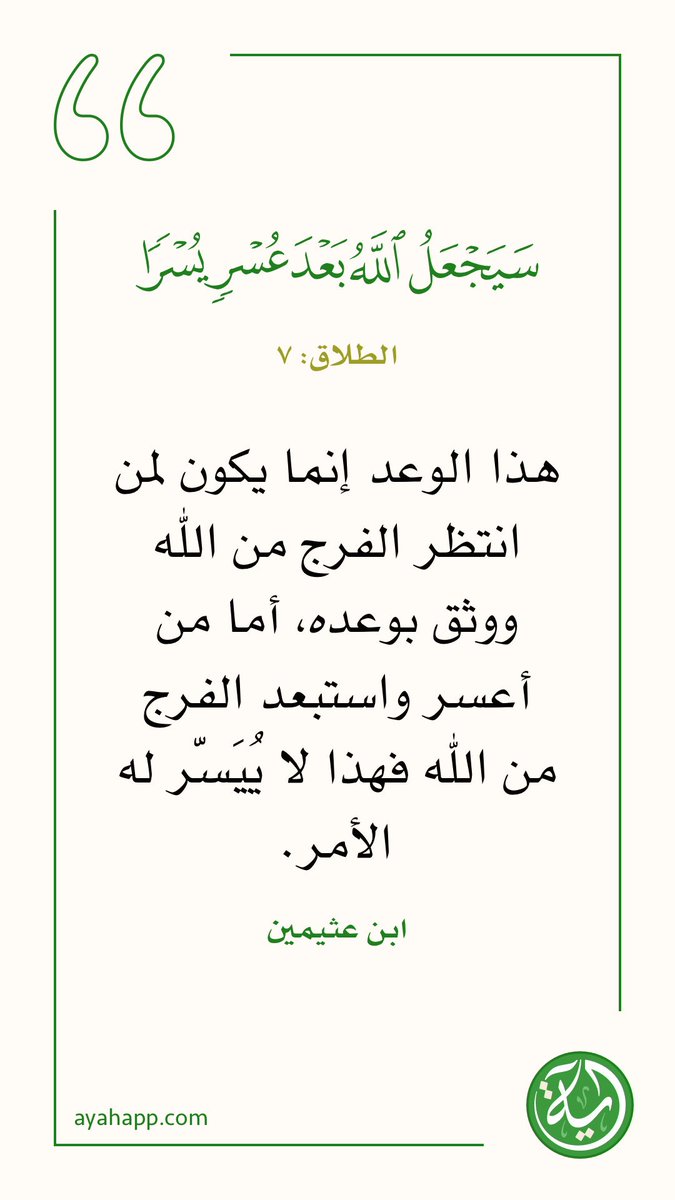 ﴿سيجعل ﷲ بعد عُسرٍ يُسرا﴾ "هذا الوعد إنما يكون لمن انتظر الفرج من ﷲ ووثق بوعده، أما من أعسر واستبعد الفرج من الله فهذا لا يُيَسّر له الأمر".pic.twitter.com/YYKITQKeQx