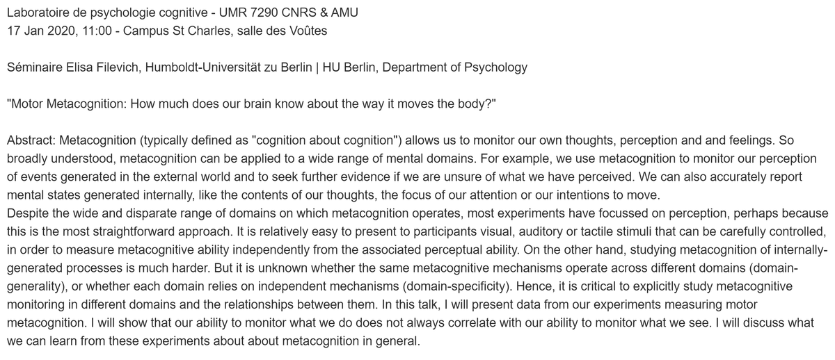 If you're interested in metacognition and happen to be around Marseille, there's an interesting talk coming up (in 30 mins @ campus St. Charles, sorry for the short notice!) by