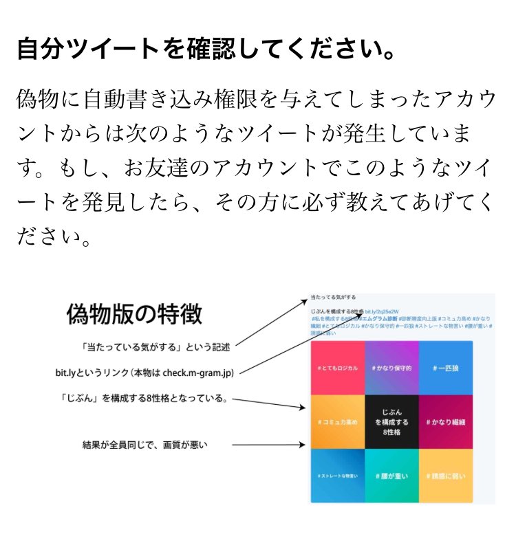 #エムグラム診断 の偽物が大規模拡散中です。絶対に偽物のリンクを踏まないようにしてください。また具体的な対策についてもブログで説明していますので気になる方は必ずお読みください。https://note.mu/spyuchan/n/nd69f392128f6 …Thanks. Twitter will use this to make your timeline better. Undo -