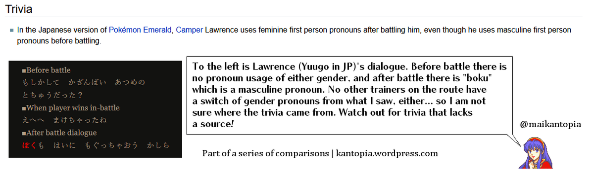 Reader: Bulbapedia's Hoenn Route 113 page says that in JP Emerald, Camper Lawrence switches from masculine to feminine pronouns before & after battle. Is this true? This is false. Lawrence nor any trainer on Route 113 does this. See link for details: https://kantopia.wordpress.com/2021/04/03/pokemon-emerald-does-camper-lawrence-switch-pronouns-before-and-after-battle-jpn-vs-eng/ …pic.twitter.com/cpYQLZx0Wn
