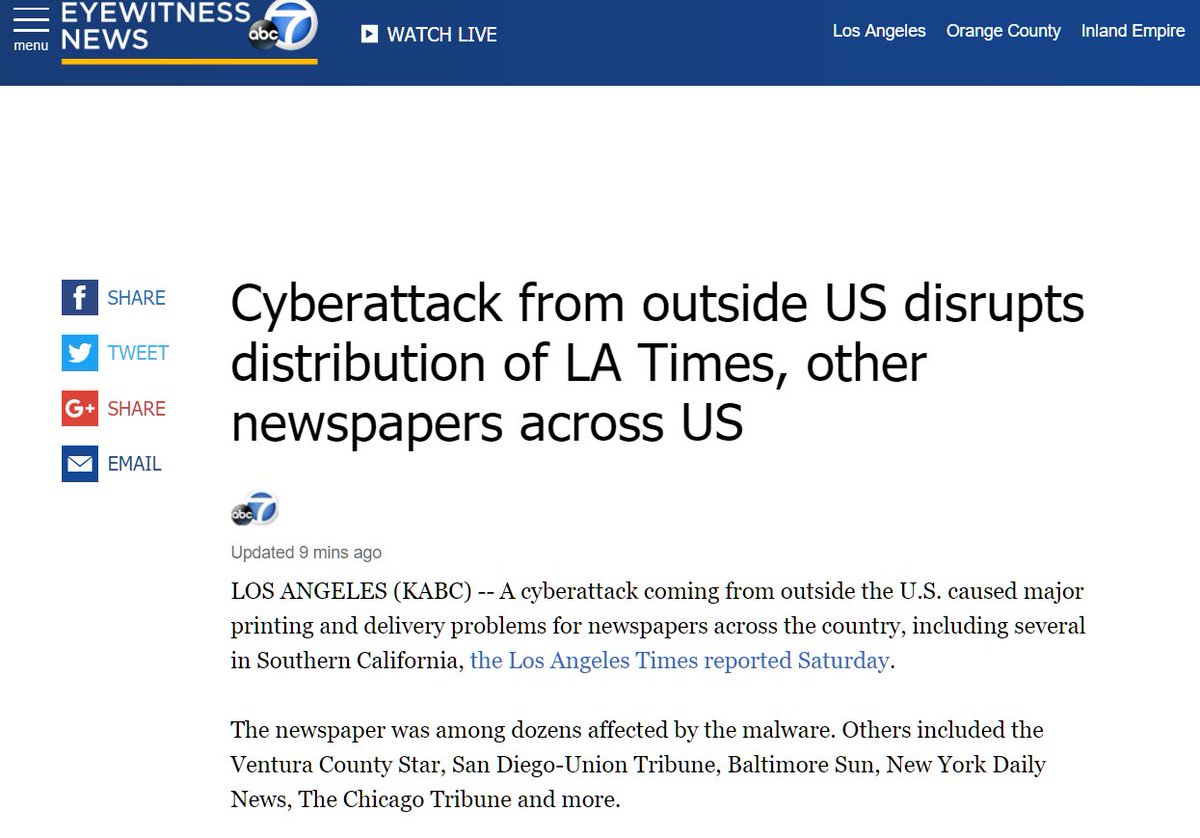 #BREAK Cyberattack Hits US Newspapers LOS ANGELES (KABC) -- A cyberattack coming from outside the U.S. caused major printing and delivery problems for newspapers across the country source: https://abc7.com/cyberattack-disrupts-distribution-of-la-times-other-newspapers-across-us/4987909/ …#mepolitics#mapol#florida#newspapers#bostonma#ca#nypic.twitter.com/9yKwxLpGbJ