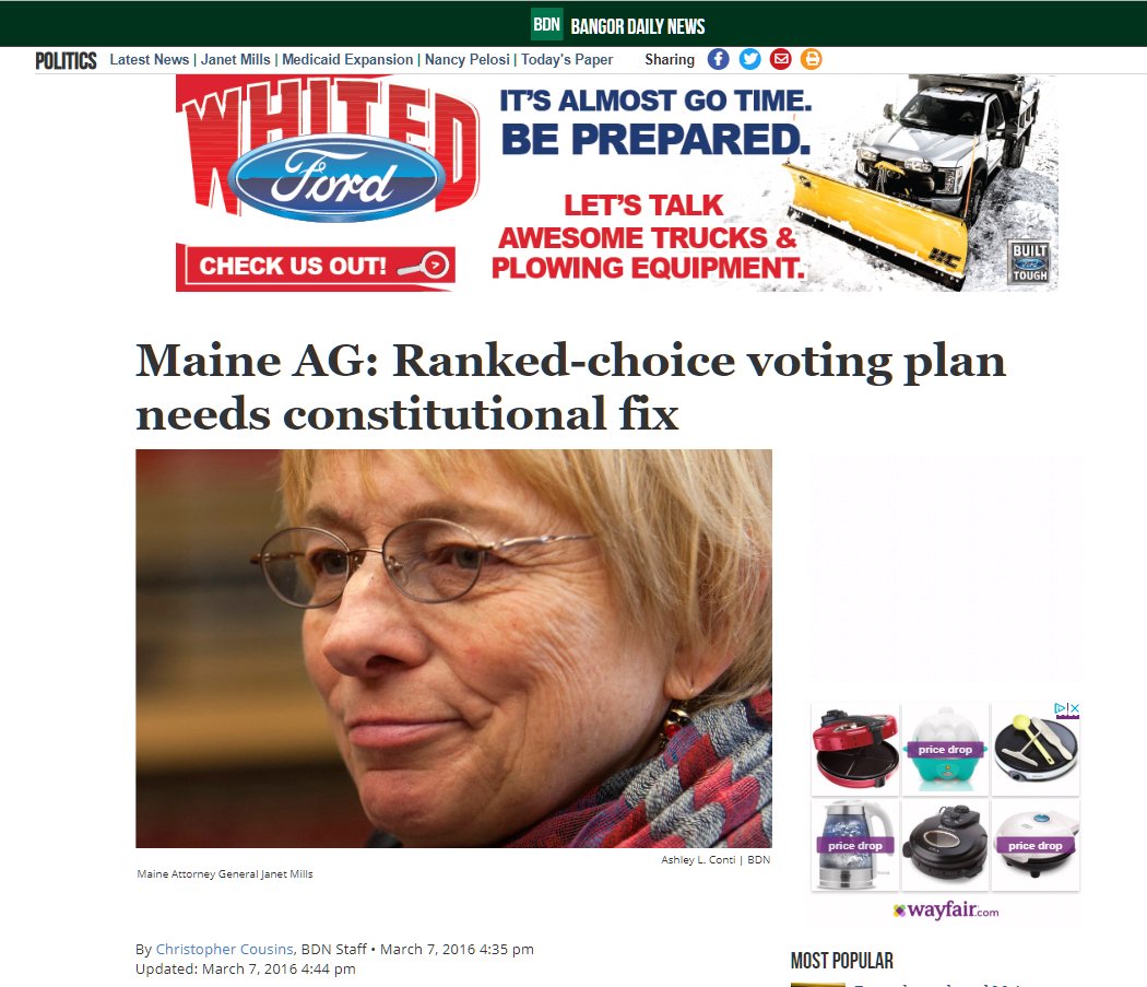 FLASHBACK: March 7, 2016 Rank Choice Voting "Attorney General Janet Mills. If we want to change our voting system, fine. But let’s start with amending the Constitution instead of adopting unconstitutional laws" SOURCE: https://bangordailynews.com/2016/03/07/politics/maine-ag-ranked-choice-voting-plan-needs-constitutional-fix/ …