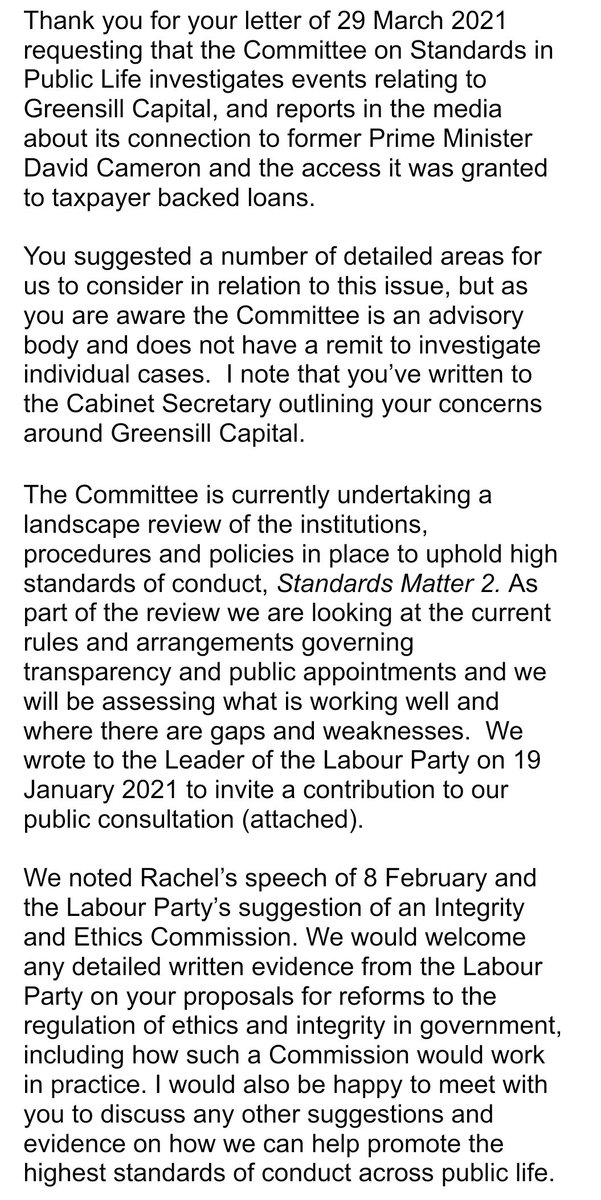 Repeatedly of late, we’ve seen cases where at the very least the perception exists that there are inadequate investigative and enforcement mechanisms around standards in public life and holding politicians to account.https://twitter.com/Gabriel_Pogrund/status/1376801698610618375 …