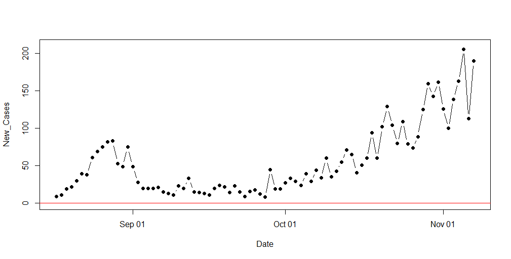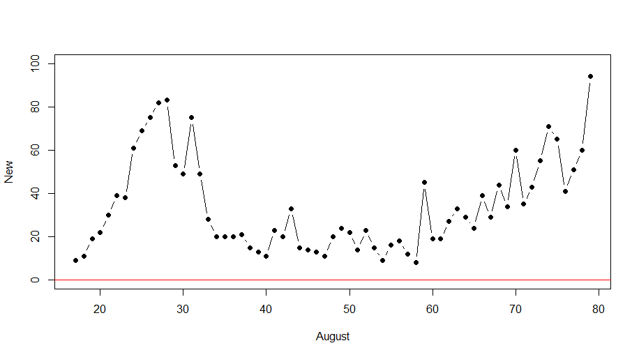 One interesting feature of this 'type="b"' plot of daily NZ Covid cases is that it highlights the increasing day to day variability.pic.twitter.com/H845i7Ro0r