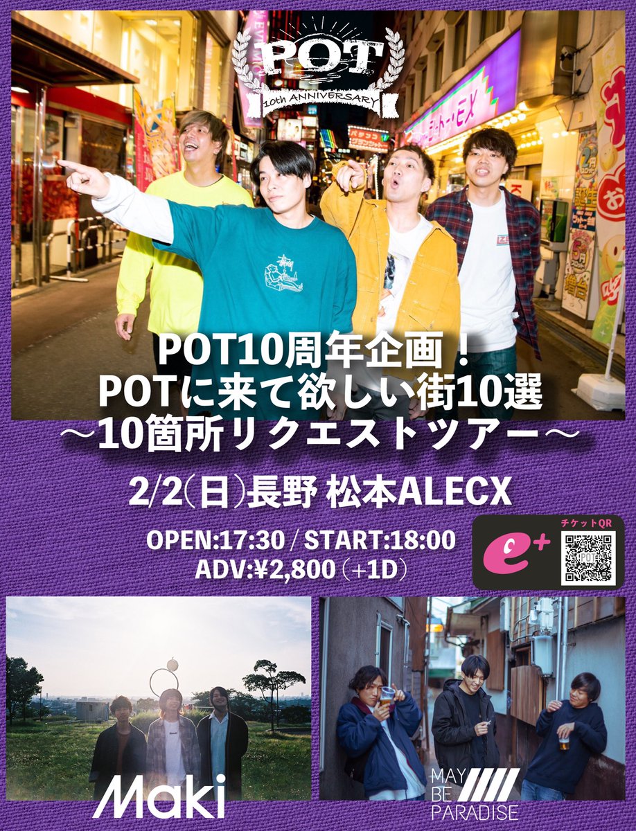 【明後日!!!】 2/2(日)松本ALECX POT10周年企画! POTに来て欲しい街10選 10箇所リクエストツアー w/ Maki / MAY BE PARADISE / 今年初の長野は松本! お待ちしてます! チケットは下記にて発売中! https://eplus.jp/sf/detail/3162910001 …pic.twitter.com/1mG3R0E8n2