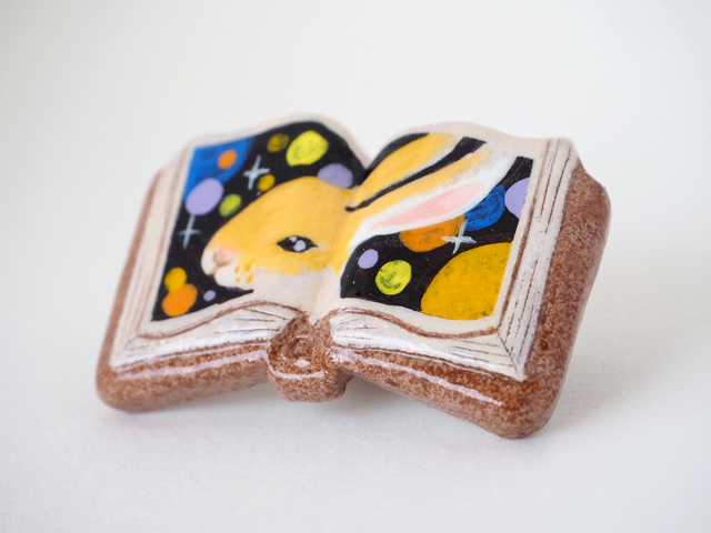 手描きで絵を入れている「絵本みたいな陶土のブローチ」や、原画、カードケース等制作販売。好きなモチーフ:鳥