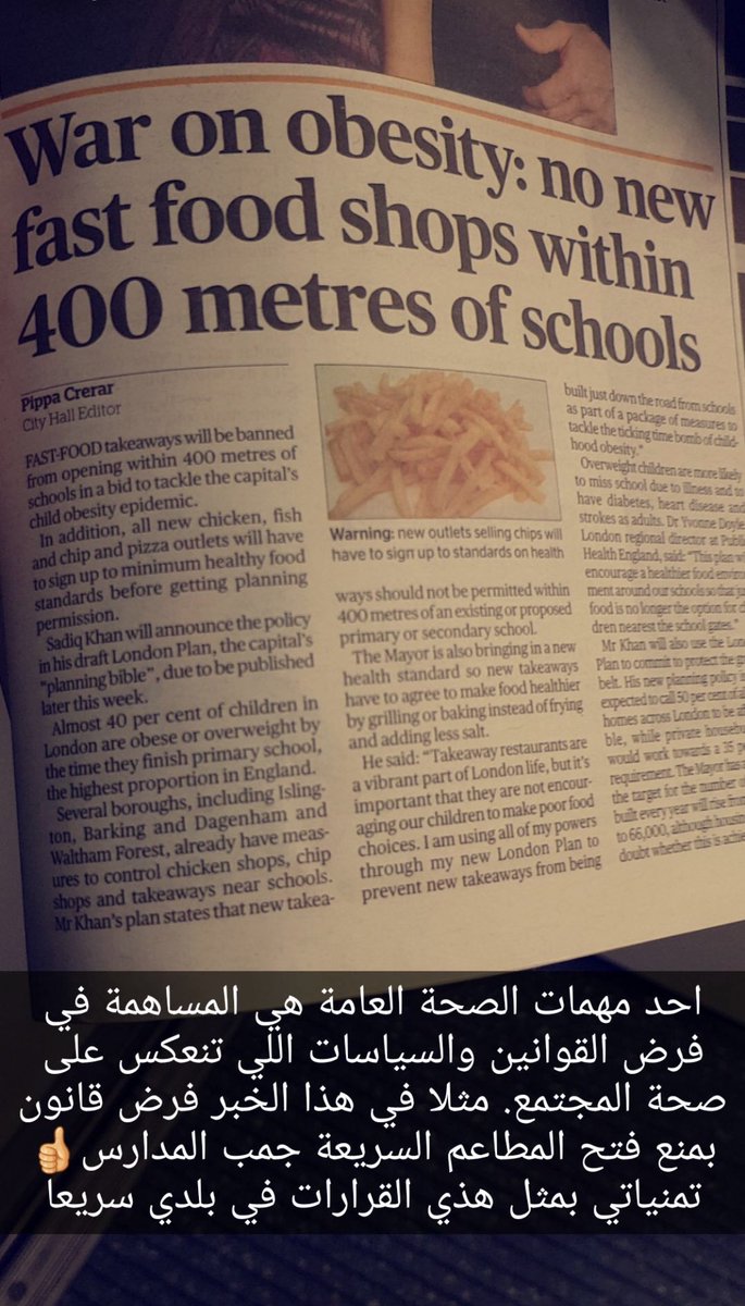 في بريطانيا ، قانون يمنع فتح مطاعم جديدة للوجبات السريعة بالقرب من المدارس، ويجب ان تبتعد ٤٠٠م عن المدرسة . نحن لا نطمح لهذا ،، طموحنا هو مقصفٌ مدرسيٌ يبيع أكلاً صحياً . الصورة من سناب