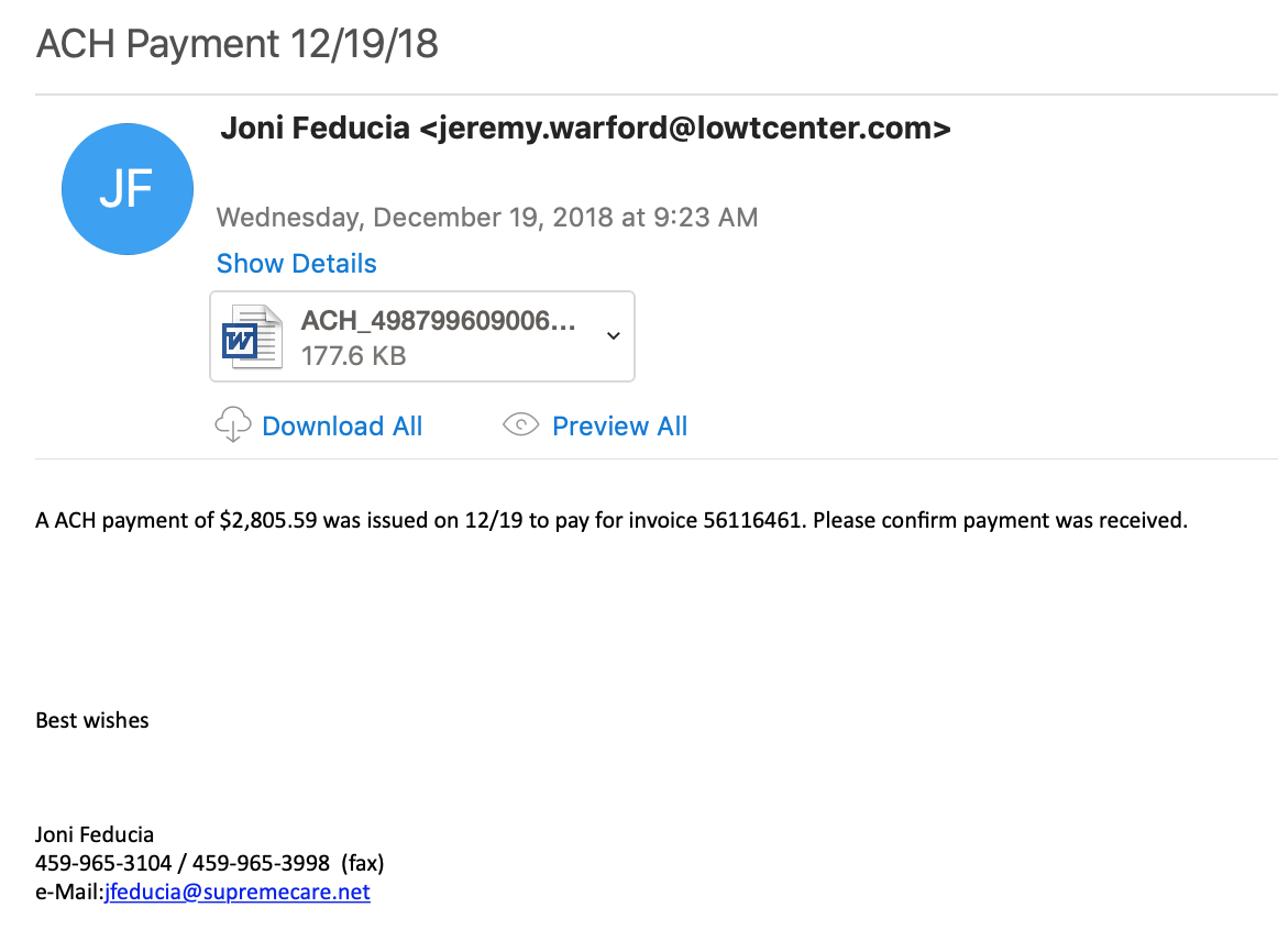 #emotet email - various senders Sub: various w/ACH https://www.virustotal.com/#/file/538fd239dd0485e51a7bd8b9514de94afb039071d48d11fe5e53cec9578d4903/detection … https://www.virustotal.com/#/file/dca9c9feb8709cbcdf94268b37d61be3390aedbc64898830bcebc513c84e59ed/detection … https://www.virustotal.com/#/file/dc70019c2daa7ade6086921bdda76a6f9fc38793c4685648068bb44b1b3d6d42/detection … https://www.virustotal.com/#/file/3ae8a2899f8102a3914eefad28028a5002fe568fd7e02f1816145f4064b65666/detection … https://app.any.run/tasks/6ff3f528-546a-4301-b506-7c534418abc5 … https://app.any.run/tasks/71c4e7f3-5f06-40c0-8907-cbdcfe13e8c0 … https://app.any.run/tasks/34ff70ce-d10f-474f-9973-e89ff90d3028 …@ps66uk@James_inthe_box@dvk01uk@malware_trafficpic.twitter.com/J5h5A8yWaY