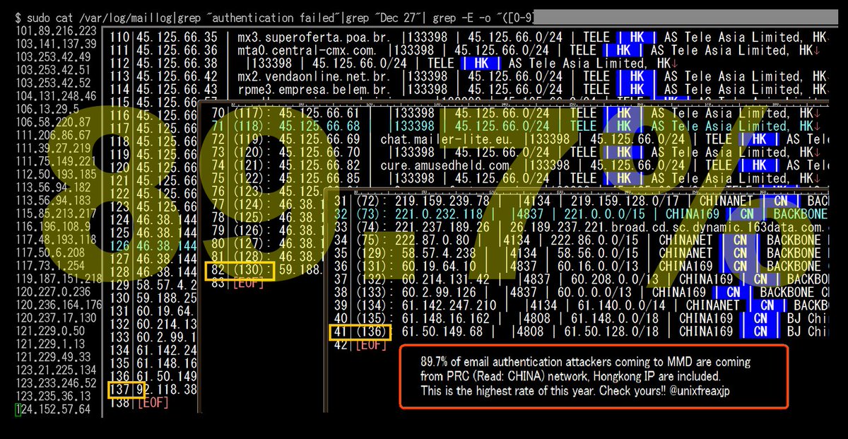 A "phenomenon" from china's network TODAY that you should aware of, grep your maillog for "authentication failed". Just counted TODAY that 89.7% of abuser IPs are coming from their network, the highest rate of the year.pic.twitter.com/8RRv45ZqS8