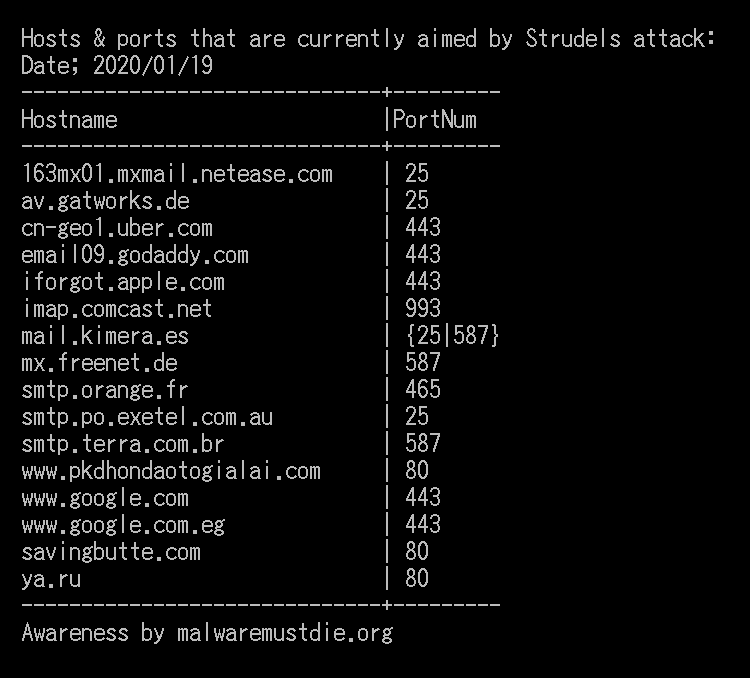 It seems the Strudel's today attacks are aiming these hosts. Please hardening your services if your network is in the list (see the port number). List is as follows (pic):pic.twitter.com/ylZKvvIHDV