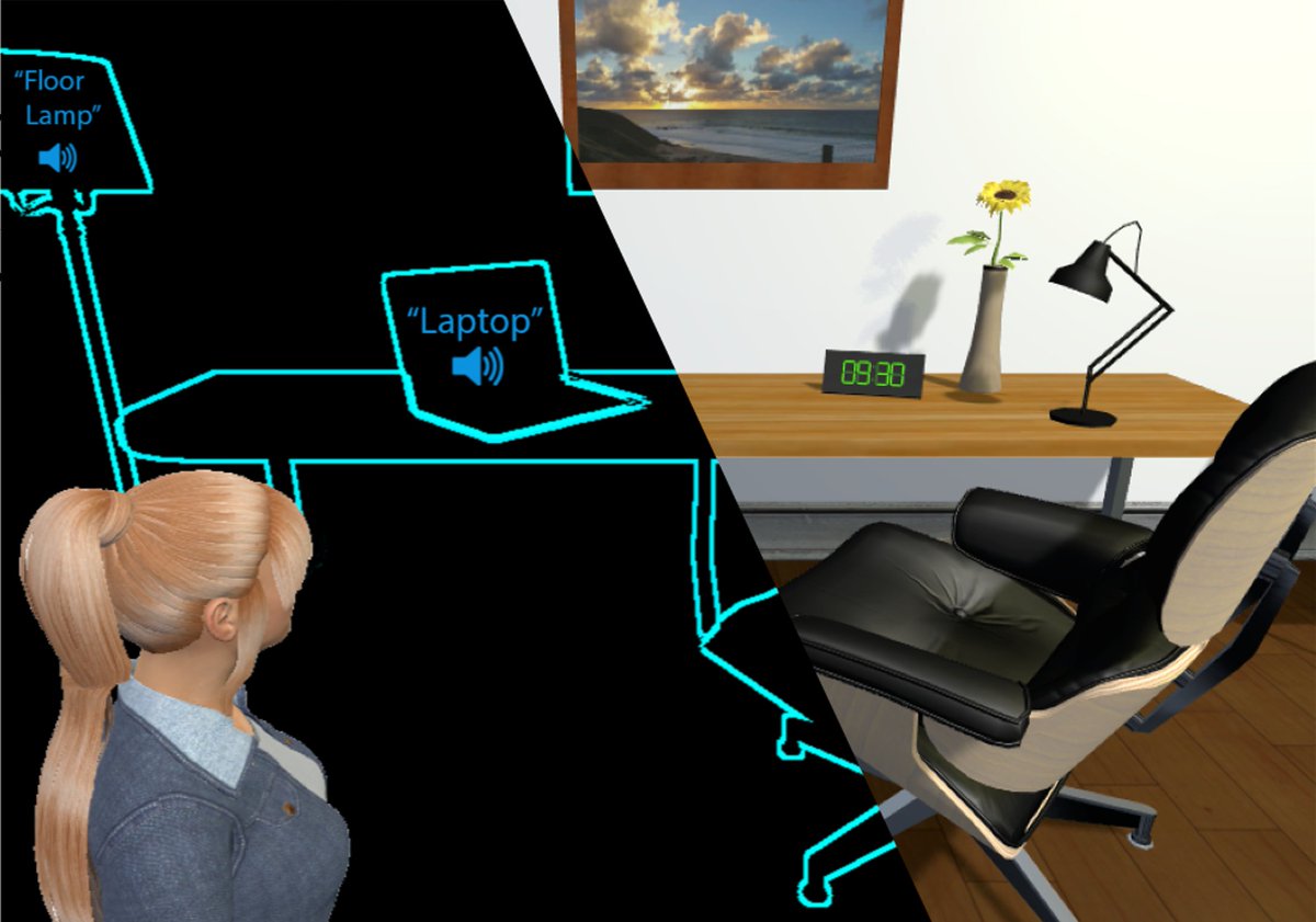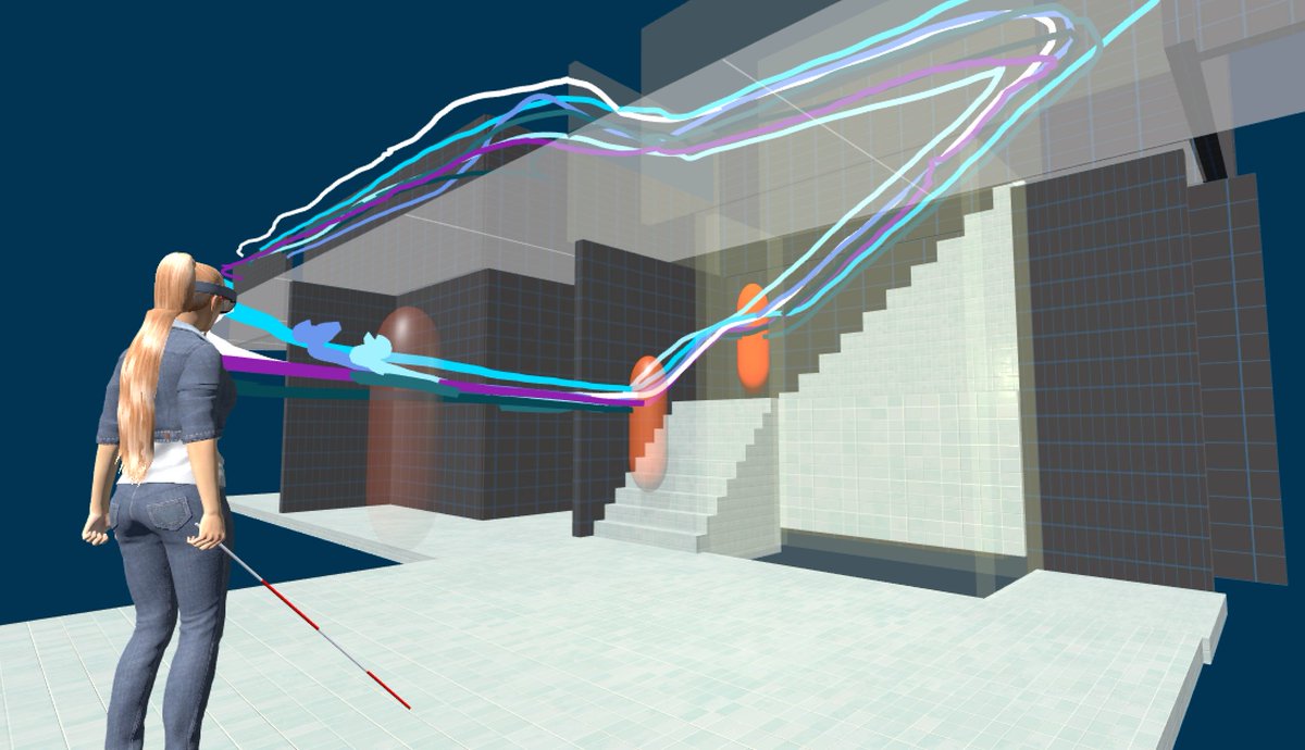 One component of CARA is a “virtual guide” that moves on a precomputed path while calling out “follow me”. This is what guided Guillermo and 6 other blind users through our building. We also developed a VR platform for standardized benchmarking of similar assistive systems.pic.twitter.com/0CLV3QYYvK
