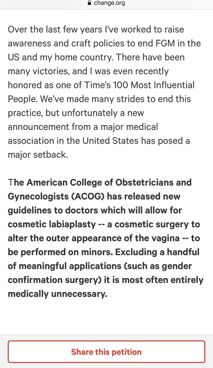 @JahaENDFGM started a petition to stop genital plastic surgeries performed on young Western girls which is a form of FGM. But this petition was closed with only 14,000 supporters. Why is that? Minors are still cut by plastic surgeonshttps://www.change.org/p/ban-cosmetic-labiaplasty-a-form-of-fgm-for-girls-under-18-in-the-u-s-endfgm …Thanks. Twitter will use this info to make your timeline better. UndoUndo -