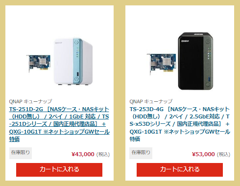 【GWセール】 QNAPの2ベイNASキット 普通のお値段・・・に見せかけて 17000円以上する10Gbit NIC 付いてきます