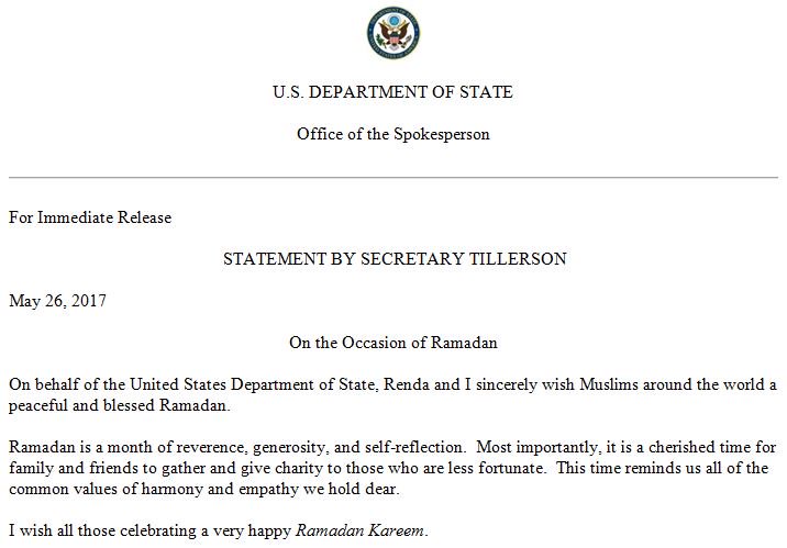 As the holy month of Ramadan begins, Secretary Tillerson wishes all those celebrating a very happy Ramadan Kareem.pic.twitter.com/OaMpU6mDZP
