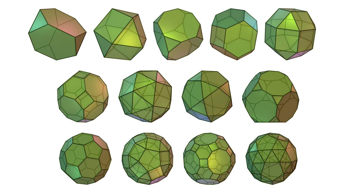 Say you use the same 2D paper shapes from the Platonic Solids but you're allowed to mix and match them. Then you get the 13 "Archimedean Solids". ❌ Faces are identical ✅ Vertices are identical ✅ Faces are regular polygons ❌ Angles around any vertex are equalpic.twitter.com/R7zt2NwOl4