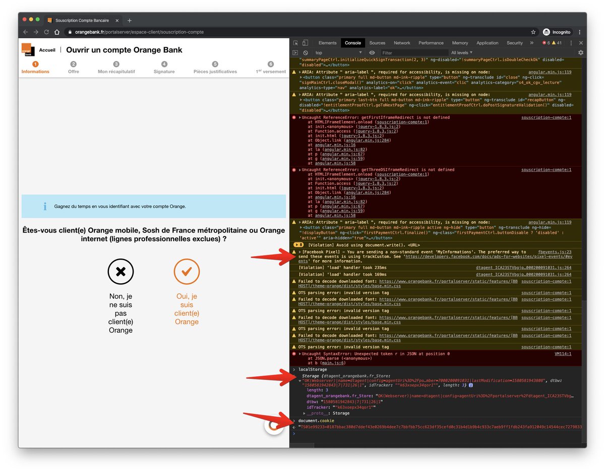 OMG ! On est dans la limite de la légalité avec Orange Bank ! Ils ne sont pas censé informer les utilisateurs qu'ils utilisent des Cookies et track leurs parcours ? Et qu'est ce que le Facebook Pixel tracker vient faire ici ? https://twitter.com/ygrenzinger/status/1223634641636249602 …pic.twitter.com/l7V1maojNy