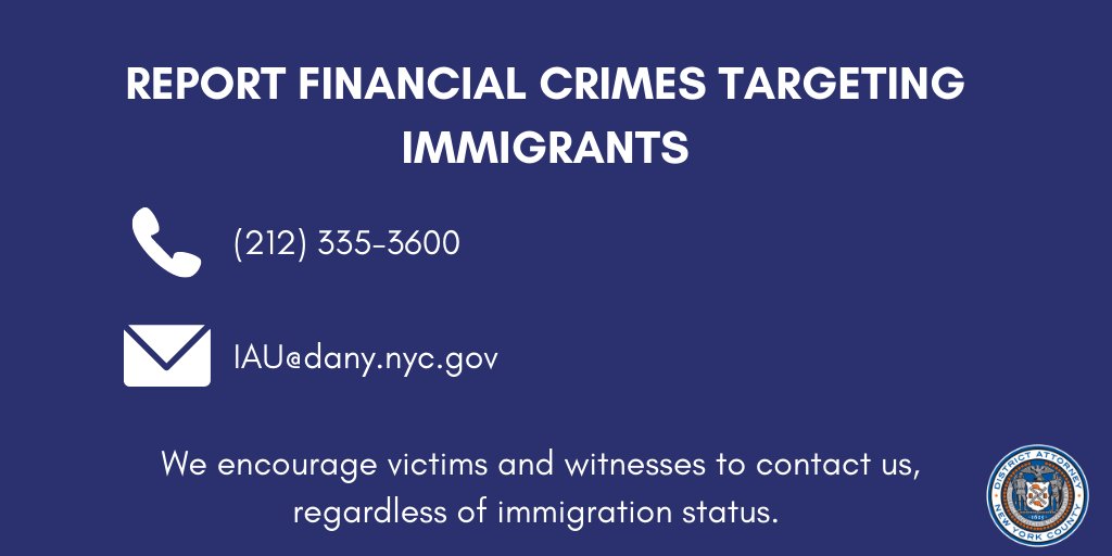 Our Immigrant Affairs Unit investigates and prosecutes financial crimes targeting immigrants. If you have been a victim of a housing or employment scam, fraud by attorneys or service providers, or a COVID-19 related fraud scheme, please contact us.pic.twitter.com/D2GF3DslYH