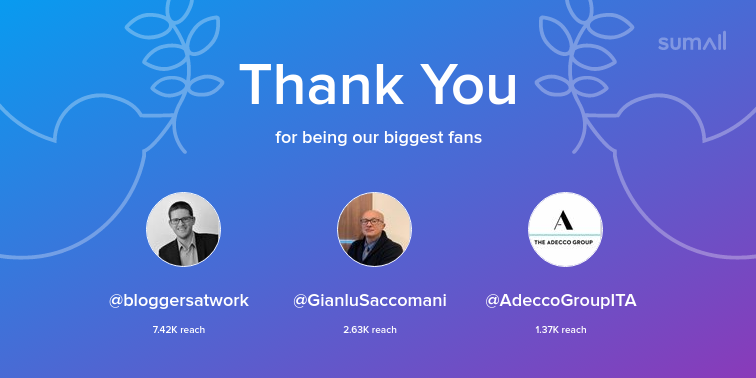 Our biggest fans this week: bloggersatwork, GianluSaccomani, AdeccoGroupITA. Thank you! via https://sumall.com/thankyou?utm_source=twitter&utm_medium=publishing&utm_campaign=thank_you_tweet&utm_content=text_and_media&utm_term=80284ef05d7b63c5ef1c255c …pic.twitter.com/k4iuPWRd19