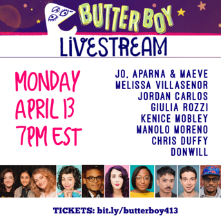 @aparnapkin@maevehiggins & Jo Firestone +@melissavcomedy@jordancarlos@GiuliaRozzi@kenicemobley@manolosomething & Chris Duffy with music@donwill 4pm PST / 7pm EST. Tix: http://bit.ly/butterboy413 pic.twitter.com/U3BAib42PX