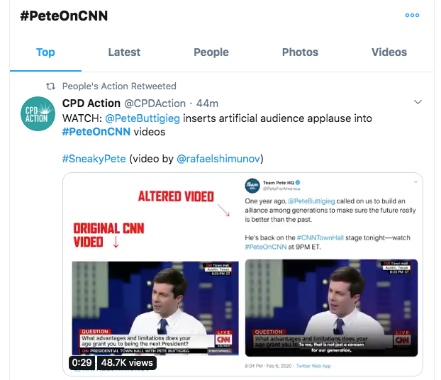 @PeteButtigieg campaign doctored CNN video in order to include wild applause is the top result for#PeteOnCNN trend.pic.twitter.com/TXPMOcJkre