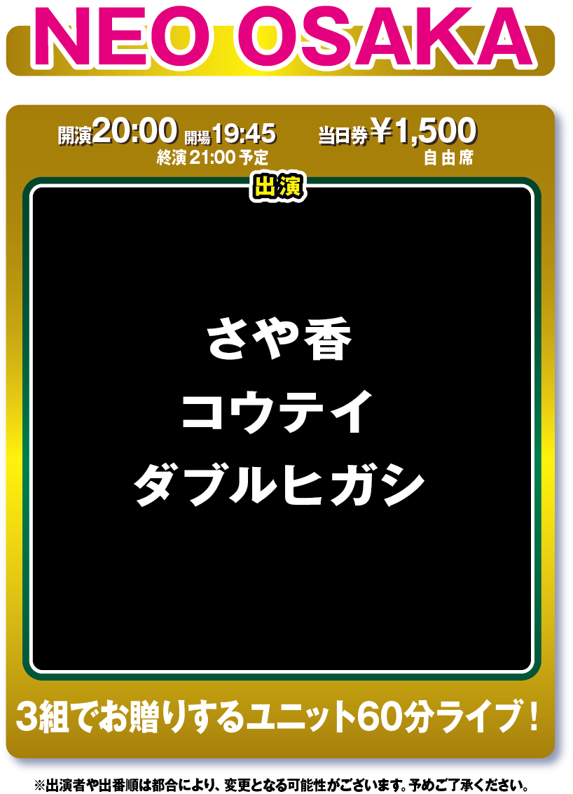 明日11/3(日) 「NEO OSAKA」 開場19:45/開演20:00 当日券¥1500 当日券あり 明日9時~限定ガチャ缶バッヂ販売! ※近隣での場所取り等はご遠慮ください。 ※混雑時はお一人様6個までのご購入で並び直しください。 https://bit.ly/2oDsuG8 pic.twitter.com/16hM59bSNb