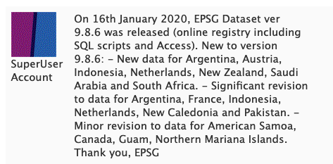EPSG projections dataset version 9.8.6 has been released, with new data for Argentina, Austria, Indonesia, Netherlands, New Zealand, Saudi Arabia, South Africa..