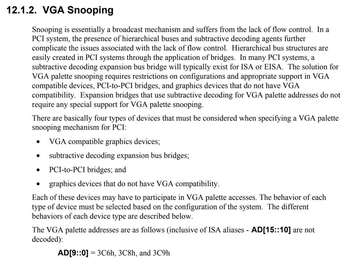 today I learned that the PCI-to-PCI bridge specification has a special hack for making an ISA VGA adapter work behind an ISA-to-PCI bridge that's behind a PCI-to-PCI bridge and this is the worst x86 thing I have learned in a while https://cds.cern.ch/record/551427/files/cer-2308933.pdf#page=126 …pic.twitter.com/ZQFvruJnnc