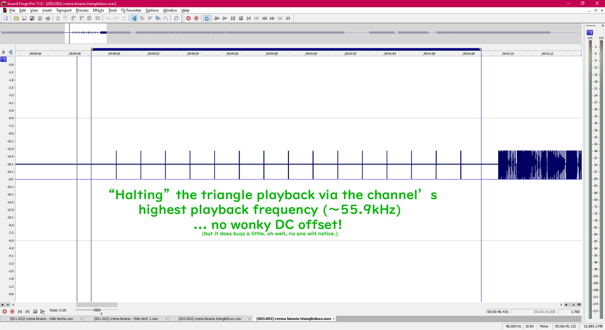 but I still wanted the triangle to give the tonal snap on that part. my solution? turns out the highest playback freq. of the triangle is ~55.9khz - way beyond human hearing! so i keep the triangle channel always "playing" with perceived mutes - which equalizes the overall DC :Dpic.twitter.com/LTtmLlP9FY