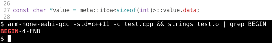 @whitequark Why is this hard? #define D(x) '0'+(x)/10, '0'+(x%10) char foo[]={'V','A','L',D(sizeof(int)),0}; $ strings a.o | grep VAL VAL04