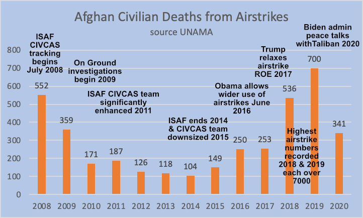 As the Biden admin looks at potential airstrikes in support of the ANDSF post withdrawal please remember the number of deaths from airstrikes. There were 3846 people killed by airstrikes from 2008-2020. Each was a person. They are not a number. 12/pic.twitter.com/nlGRUTaktx