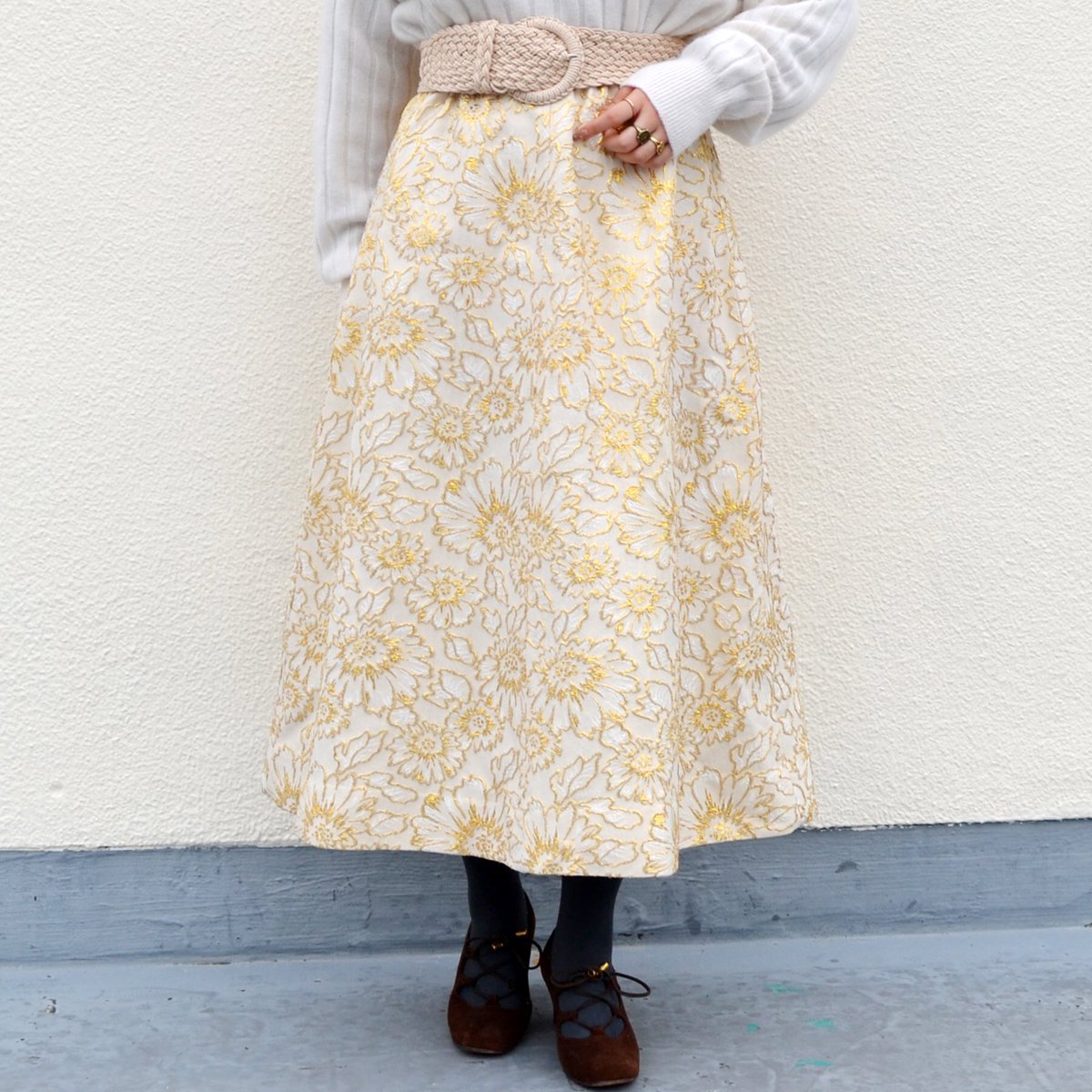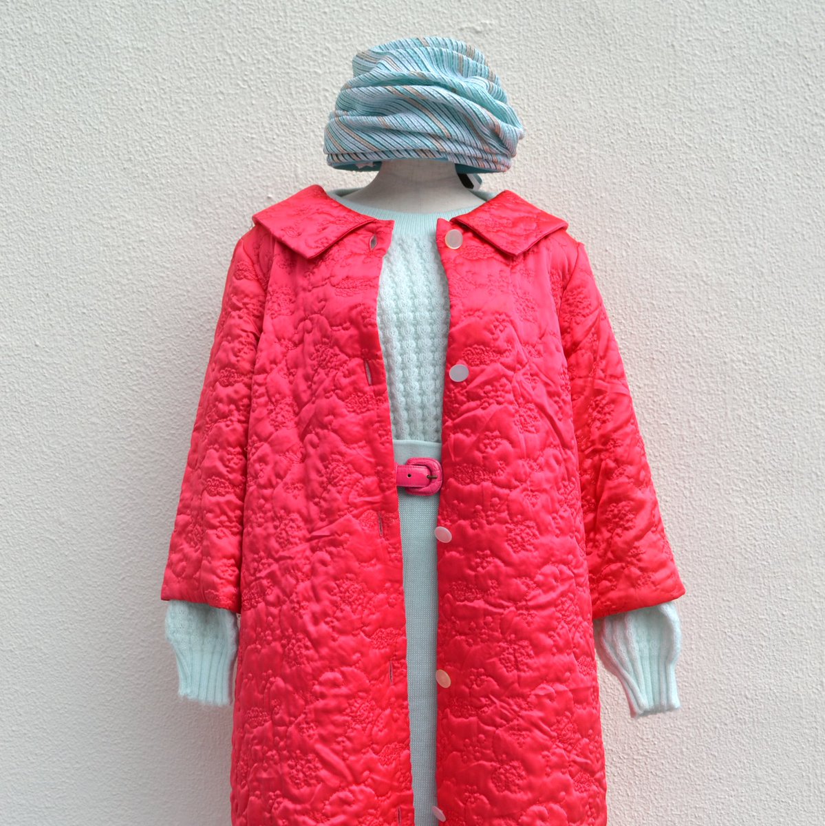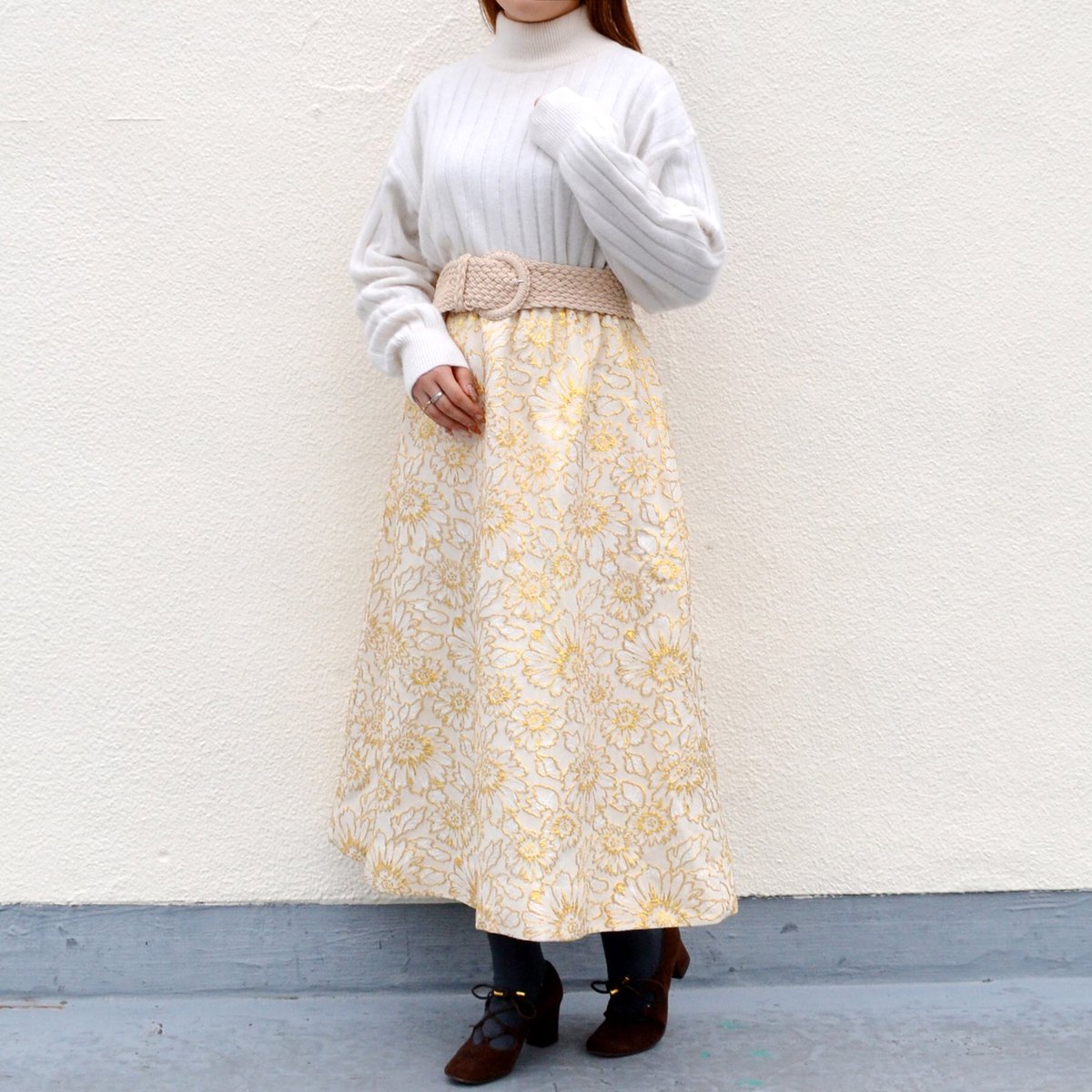 ミントカラーのふわふわニットにタイトスカート、お花やリーフデザインのステッチがきいたvintageガウンをあわせて