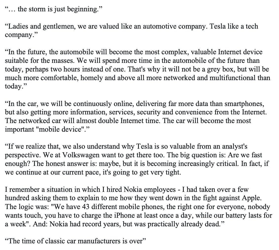 Volkswagen CEO Herbert Diess signalling the time of classic car companies is over. VW must become a tech company like Tesla or perish like Nokia did against Apple.pic.twitter.com/6wObK8EYfH