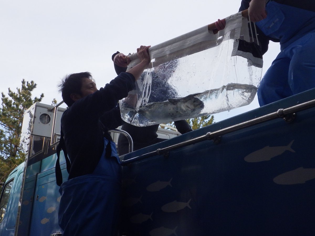 スマの搬入の様子です。 先日、日本海大水槽に搬入しました。 活発に泳ぎ回る姿がご覧いただけます。
